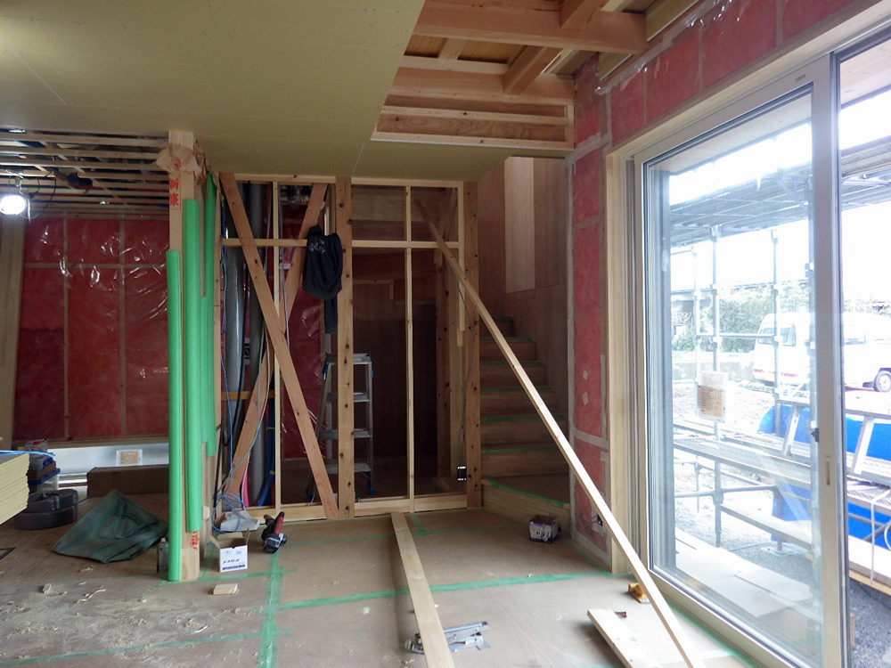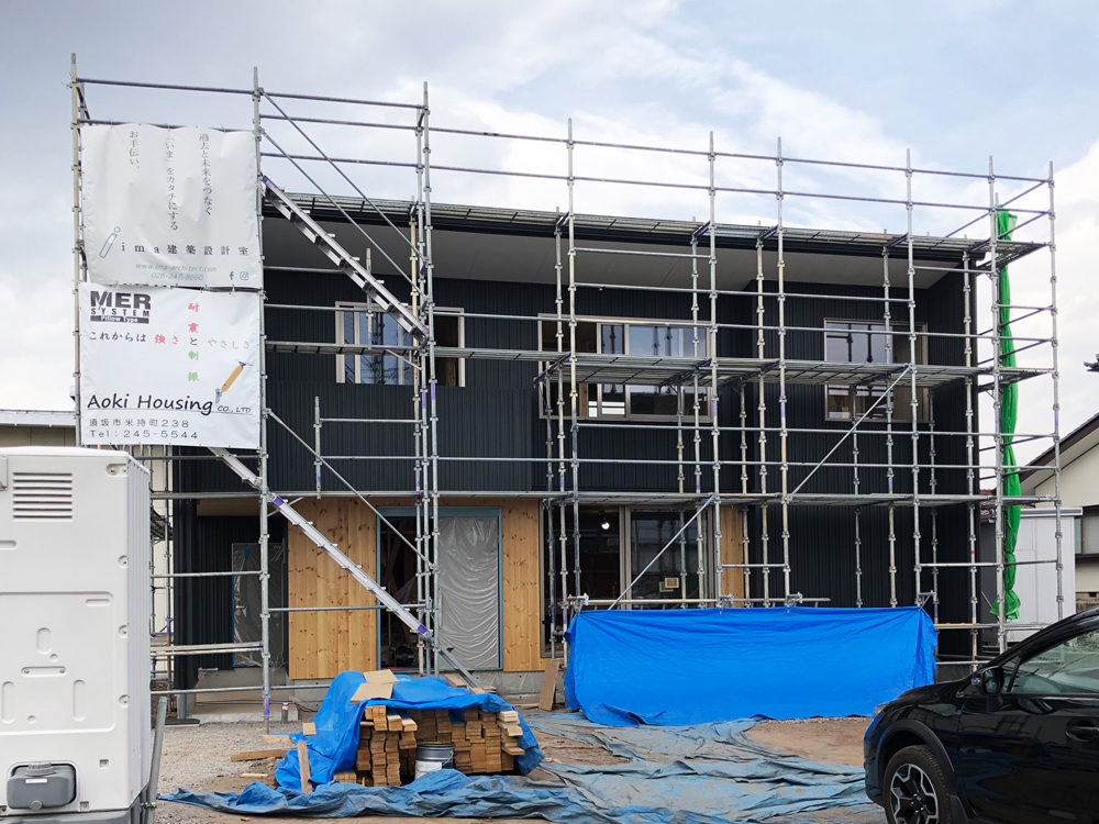 2018/04/05 外壁工事ほぼ完了 須坂市のHouseA1は外壁工事がほぼ完了しました。 今回はグレーブラックのガルバリウム鋼板スパンドレル張りでシャープな印象を持たせながらも、1階の一部の外壁と軒天井をを温かみを感じさせるパイン板張りとしてバランスをとっています。 軒を大きくとっているので、夏場はしっかり日差しを遮ってくれるでしょう。 内部の工事も着々と進んでいます。 先日 階段も取り付けられました。 テラス戸の上の吹き抜け部分は…またのお楽しみ。 僕もとても楽しみなところです。 仕事 ブログ一覧へ戻る