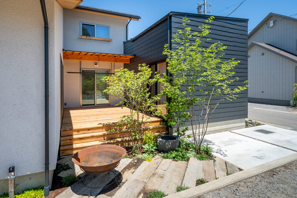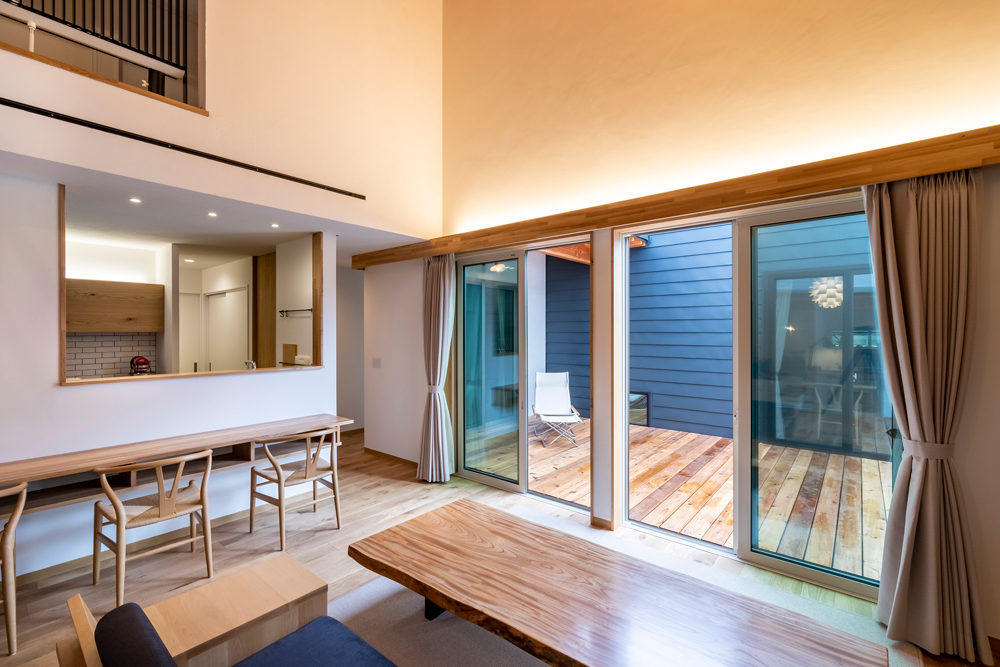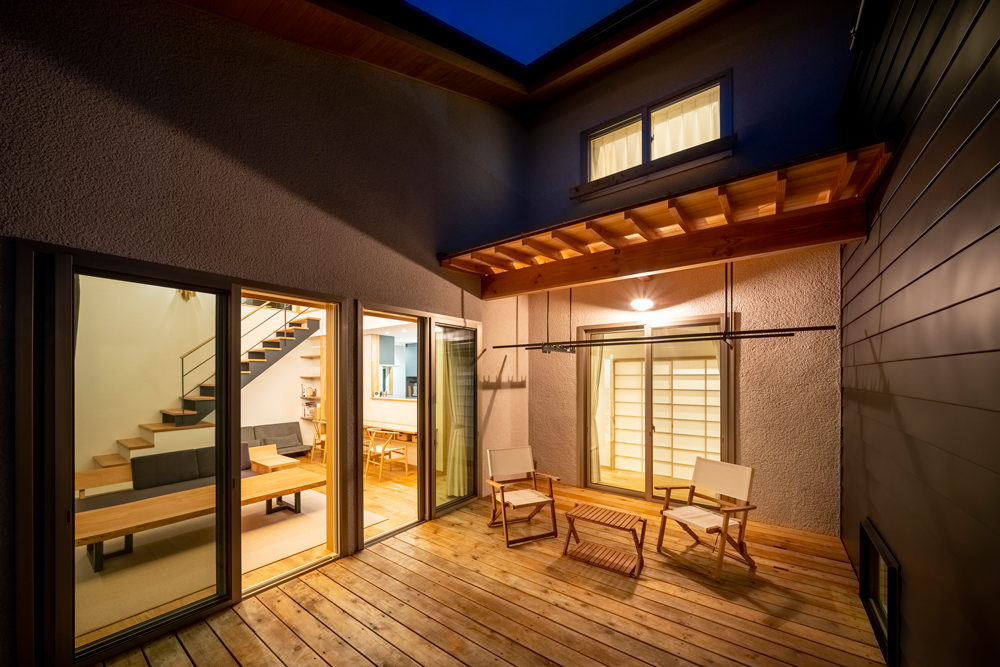 来客のあるSOHOゾーンと家族がくつろぐ住まいのゾーンを緩く分離をしながらも、ウッドデッキの中庭を通してつながってゆくコの字プランにまとめました。