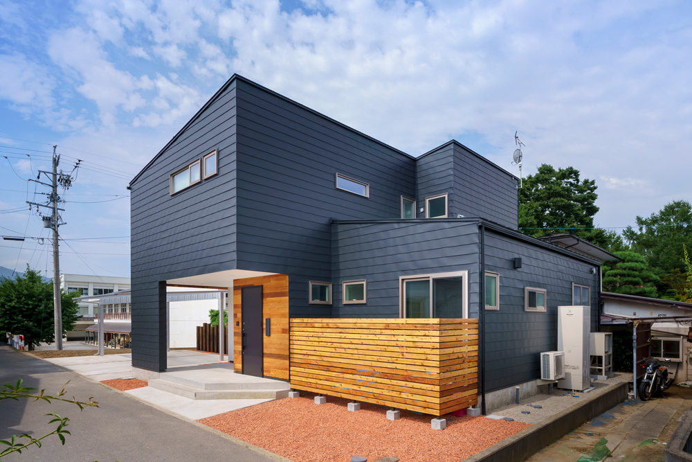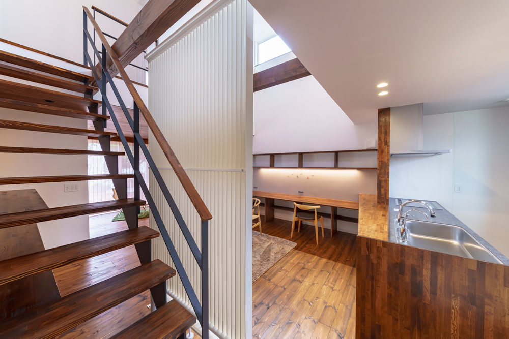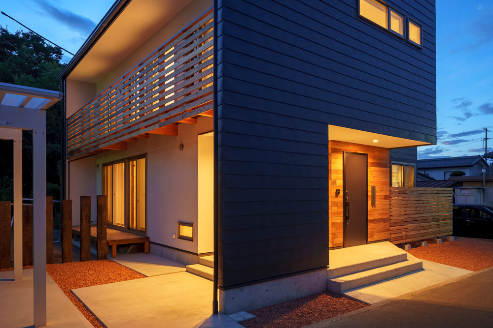 外観はガルバリウム鋼板一文字葺きの外壁が水平に通ったラインと僅かな陰影をつくりだし、落ち着いた印象を与えています。